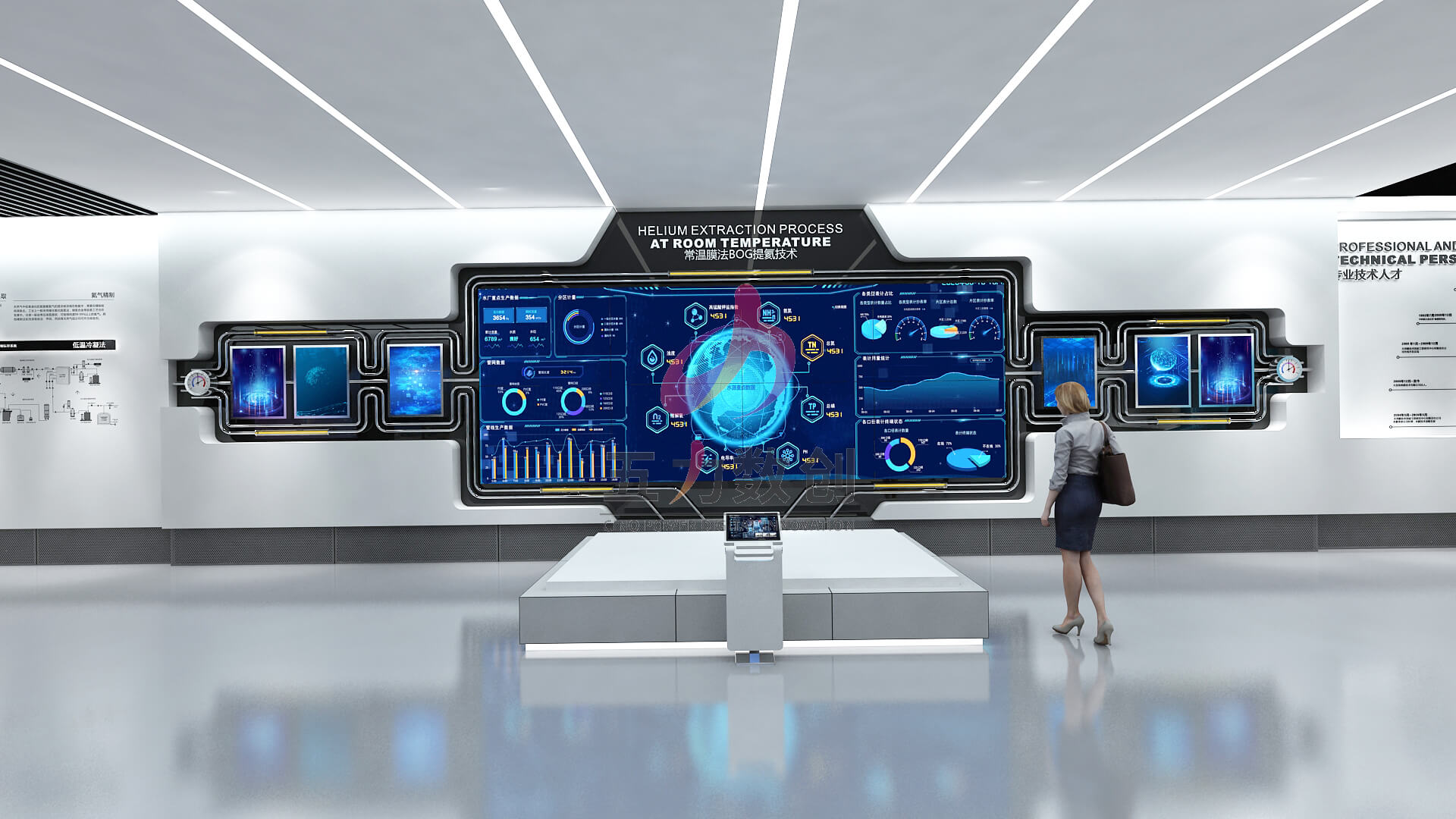 近年來(lái),在能源危機(jī)壓力下,加速了能源系統(tǒng)向綠色低碳轉(zhuǎn)型,新能源行業(yè)的競(jìng)爭(zhēng)日趨激烈。五力數(shù)創(chuàng)以科技,數(shù)據(jù),智慧方向?yàn)樗伎?;結(jié)合氦氣工業(yè)能源行業(yè)獨(dú)特性,采用簡(jiǎn)潔白色帶有科技屬性藝術(shù)裝置搭建應(yīng)用場(chǎng)景,講述能源戰(zhàn)略布局,世界貿(mào)易,生產(chǎn)技術(shù),物流運(yùn)輸,數(shù)字化管理等產(chǎn)業(yè)鏈條展示。為瑞華能源集團(tuán)量身打造個(gè)性化的新能源企業(yè)展廳。
